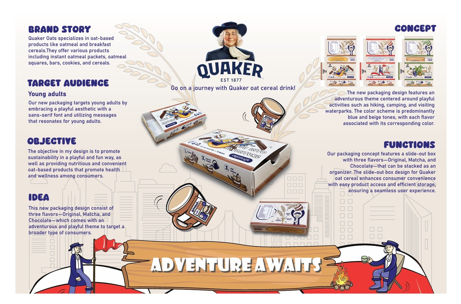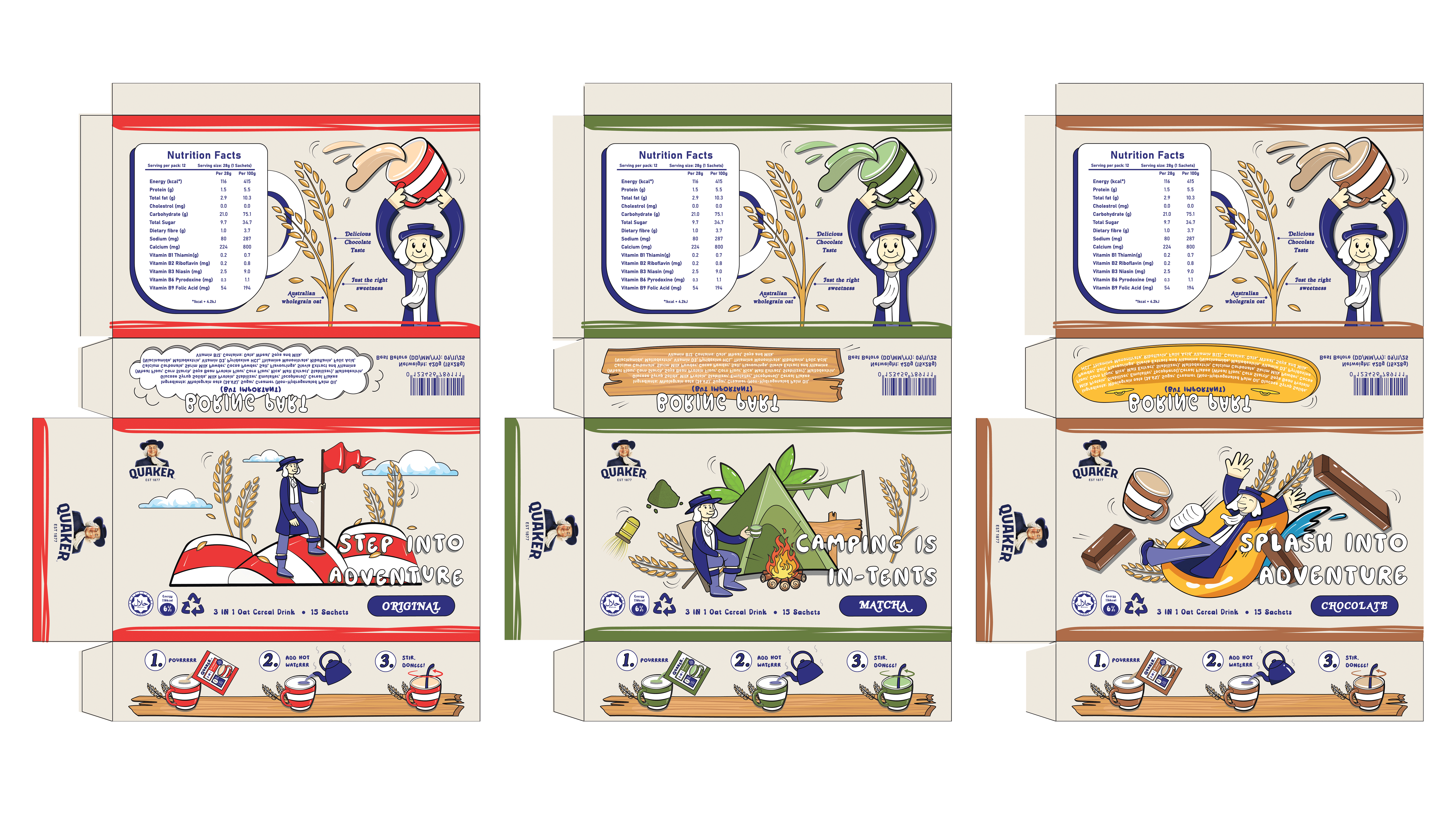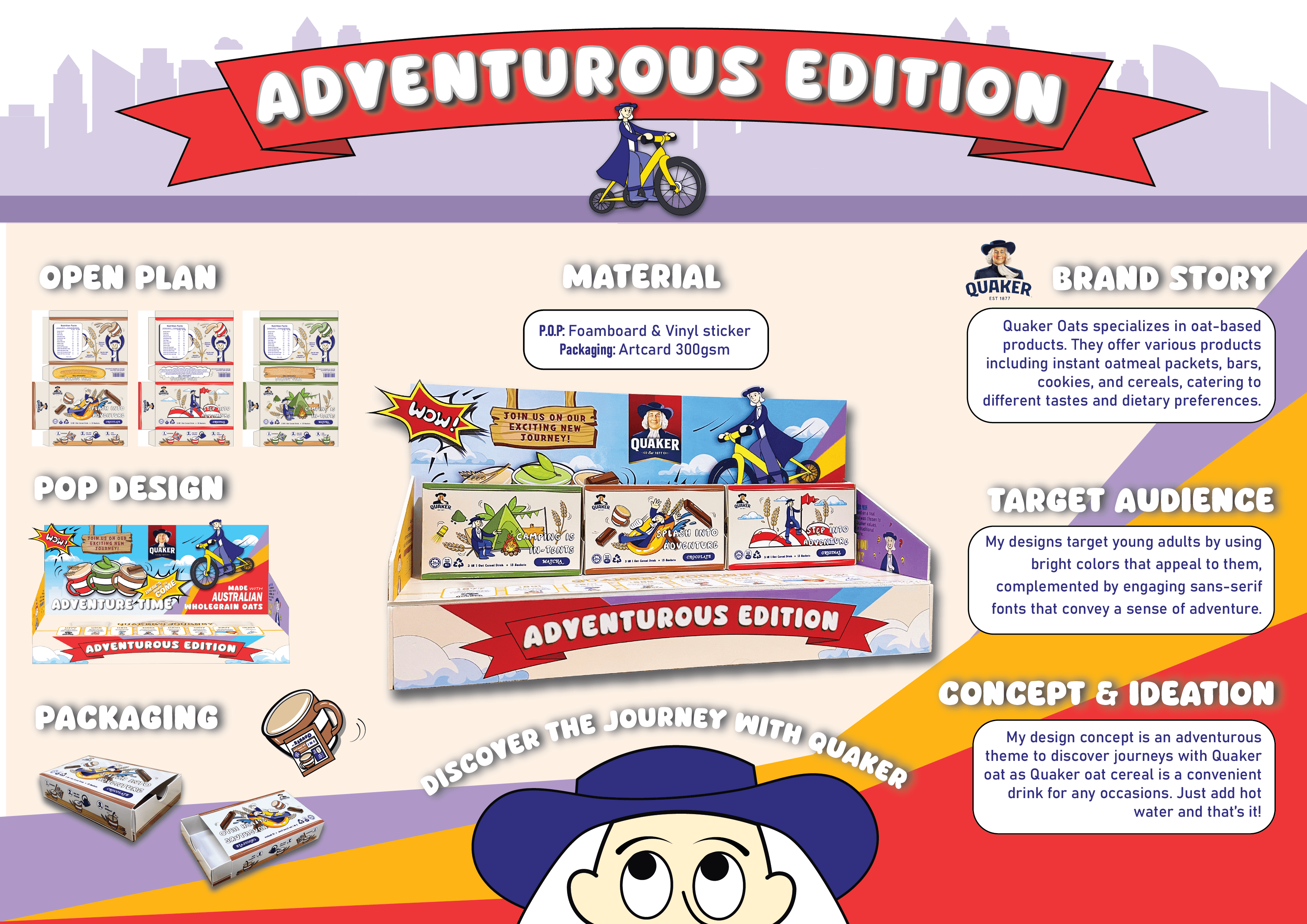 For this project, I redesigned the packaging of Quaker Oat with a focus on sustainability. The outcome includes a series of cohesive packaging designs that align with the brand identity while minimising environmental impact. Additionally, I created a point-of-purchase (POP) display design to enhance product visibility and attract customers in retail settings.
